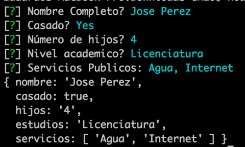As you can see what I did was create an array with objects with the definitions of the types of questions outlined above and this arrangement is passed to inquirer.prompt function and as the second parameter an anonymous function is pass to prints the user's responses.