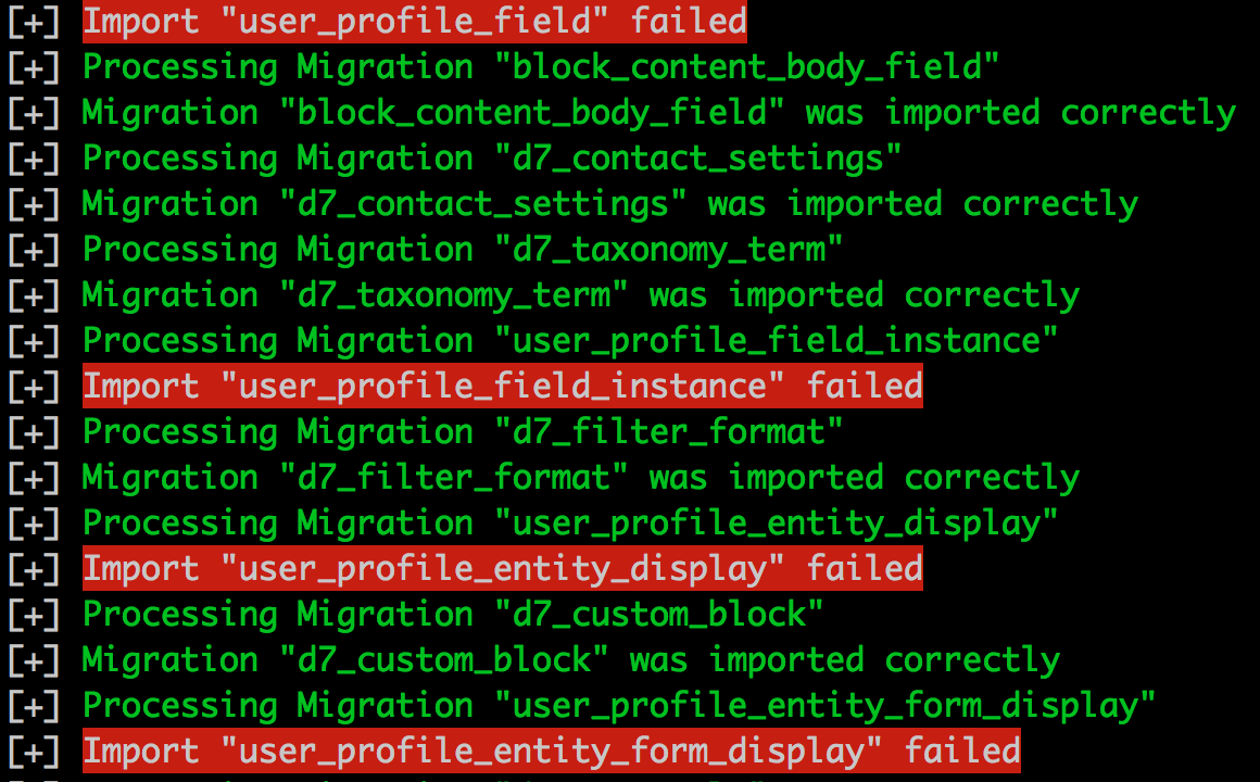 The image above shows how the command report what migrations fail and what migration works. As you can see each migration is independent and the migration process is not interrupted if some of them fail.